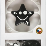 Praktická čiernobiela súprava hrkálok pre bábätká kombinuje reťaz na kočík a samostatnú hrkálku v tvare hviezdičky alebo kvietka. Kontrastné farby podporujú vizuálne vnímanie, zatiaľ čo jemný zvuk a bezpečné tvary rozvíjajú motoriku a zmysly dieťaťa. Hrkálky sú navrhnuté na pohodlné uchopenie a spĺňajú prísne hygienické normy. Bez ostrých hrán, bez malých uvoľniteľných častí a ideálne na každodenné hranie doma aj na cestách.