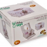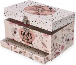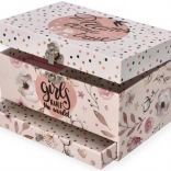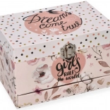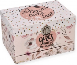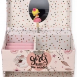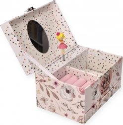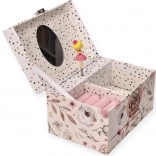 Táto nežná ružová šperkovnica s kvetinovým a bodkovaným motívom ukrýva vo vnútri všetko, čo malé slečny milujú: po otvorení veka sa rozoznie melódia a na hriadeli sa roztočí balerína pred oválnym zrkadielkom. Vo vnútri nájdete prakticky členený priestor s vankúšikmi na prstienky aj priehradkami na drobné poklady.