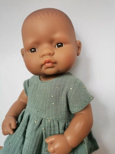 Doprajte bábike nový šatník s elegantnými šatami pre bábiku 32 cm. Dizajn s motívom neba na tmavej mäte pôsobí hravo aj štýlovo a skvele sa hodí na každodenné hranie aj špeciálne príležitosti. Odev je starostlivo ušitý v Poľsku s dôrazom na detaily a príjemný materiál.