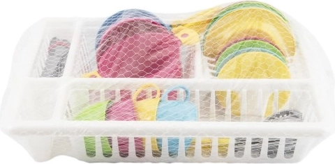 Súčasťou je odolný odkvapkávač, ktorý pomáha udržať poriadok po „umývaní“ riadu a učí deti základom organizácie. Vďaka praktickému košíku sa sada ľahko prenáša aj ukladá.