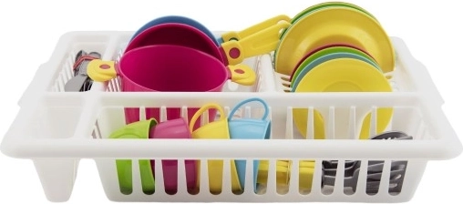 Farebná detská sada riadu s bielym odkvapkávačom. Ľahký plast, bohatá výbava a jednoduché ukladanie. Ideálne pre kreatívnu hru v detskej kuchynke.