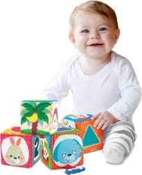 Objavte sadu 4 farebných textilných kociek pre bábätká a batoľatá, ktoré rozvíjajú zmyslové vnímanie, jemnú motoriku a učenie čísel a tvarov. Každá kocka má rôzne textúry, bezpečné zrkadielko a ilustrácie zvieratiek, čísel a tvarov. Kocky možno skladať do stabilnej pyramídy a tvoriť z nich obrázkové série na zábavné učenie.