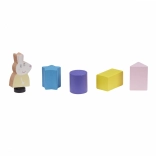 Štyri farebné dieliky rôznych tvarov pomáhajú deťom rozvíjať jemnú motoriku a logiku pri správnom priraďovaní otvorov.