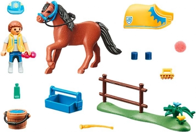 Súčasťou balenia je figúrka dieťaťa, poník s dekou a uzdou, jazdecký klobúk, vedro, taška, kefa a ďalšie doplnky. Dieliky sú ľahko umývateľné, odolné a bezpečné pre deti.
