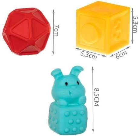 Majú krásne živé farby, ktoré dokonale stimulujú vývoj vášho dieťaťa. Vďaka špeciálnym prehĺbeniam a výstupkom môže dieťa spájať kocky do radov. Zmyslové hračky formujú schopnosť prijímať, chápať a reagovať na podnety z okolia. Pomocou kociek môžeme zlepšiť koordináciu pohybu a stimulovať zmysly, ako je sluch, zrak alebo hmat. Bloky po stlačení vydávajú jemný klasický zvuk, ktorý bude pre vaše dieťa príjemným a zaujímavým zážitkom. Bloky sú vyrobené zo špeciálneho mäkkého materiálu, ktorý je veľmi mäkký a ľahký a neobsahuje žiadne škodlivé látky, takže je ich možné používať ako hryzadlo pre dojčatá. Senzorické podložky sú vizuálne atraktívne a majú starostlivú, precíznu povrchovú úpravu. Ich pestré farby, rôzne tvary a veľkosti pritiahnu detské oči a určite ho povzbudia ku hre.