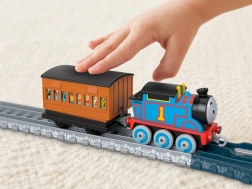 Mašinka TOMÁŠ na tlačenie prechádza po plastových koľajniciach, cez most a popri značení. Deti môžu ľubovoľne stavať a meniť trasu.