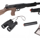 kovová karabína, pištoľ na 8 nábojov so zásobníkom, ďalekohľad, legitimácia tajného agenta