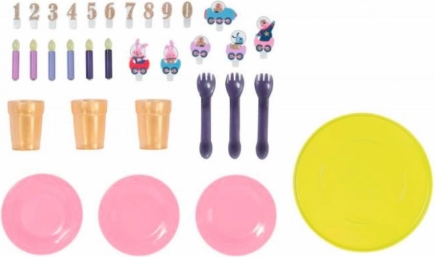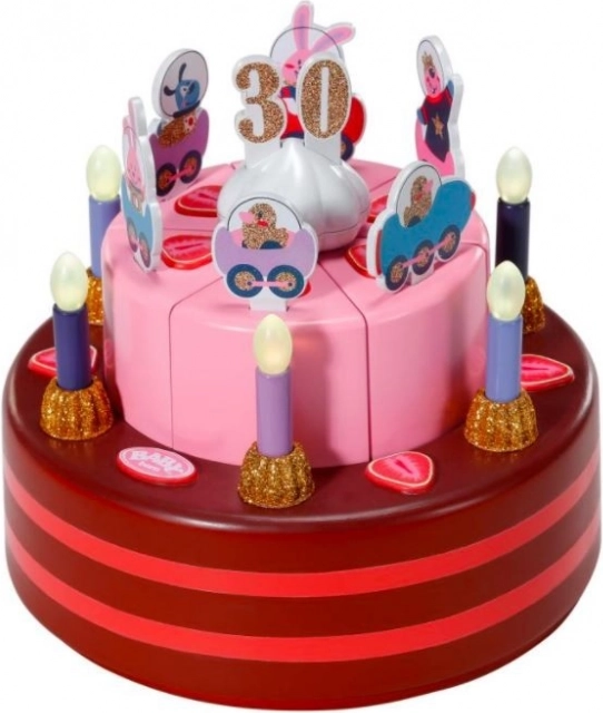 Tortová doska má dve poschodia a je rozdelená na 6 častí, z ktorých každá môže byť ozdobená číslami a obrázkami. Keď Baby Born sfúkne sviečky, torta zahrá narodeninovú melódiu.