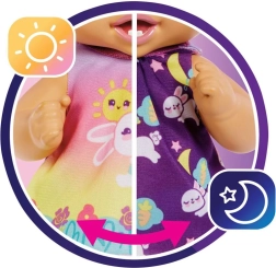 Šaty jednoducho otočíte: farebná denná varianta a tmavšia nočná s motívom spiacích králičkov. Skvelé na hranie scenárov dňa a večerného ukladania.