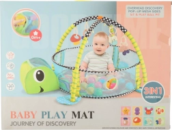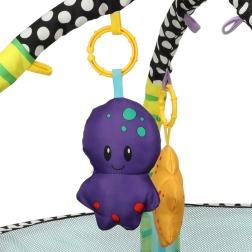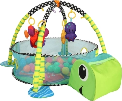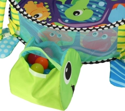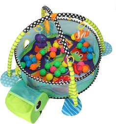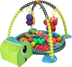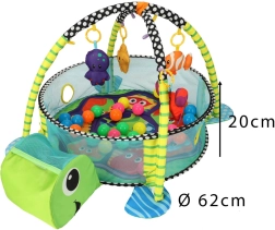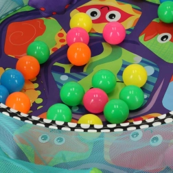Hračky a loptičky: Deka obsahuje farebné a mäkké hračky ako rybku, chobotnicu, hviezdicu a krabičku so zrkadielkom. Navyše 30 plastových loptičiek v živých farbách stimuluje zmysly dieťaťa.
