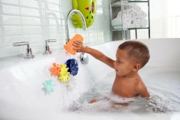Premeňte kúpeľ na malú laboratóriu! Farebné ozubené kolieska s prísavkami ľahko pripevníte na hladký povrch vane či obkladov. Keď cez ne pustíte vodu, začnú sa točiť a spoločne tvoria interaktívny vodný systém, ktorý deti motivuje k objavovaniu a experimentovaniu.