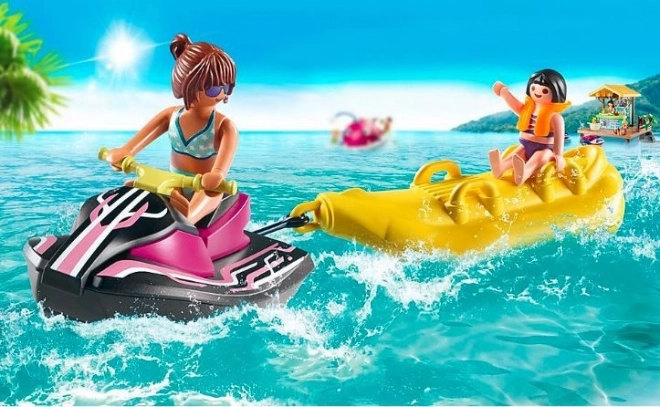 Zažite nezabudnuteľné prázdninové zážitky s Playmobil Family Fun Štartovací balíček. Tento hrací set obsahuje všetko potrebné pre vodné dobrodružstvo - vodný skúter, banánovú loď a figúrky. Deti môžu použiť tento set na nápaditú hru, kde môžu vytvárať príbehy o vodných športových aktivitách.