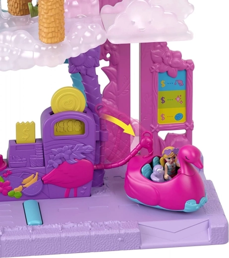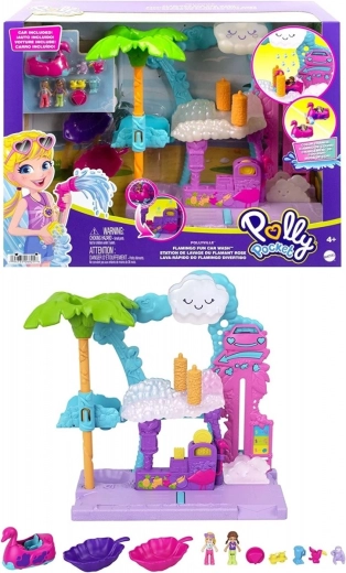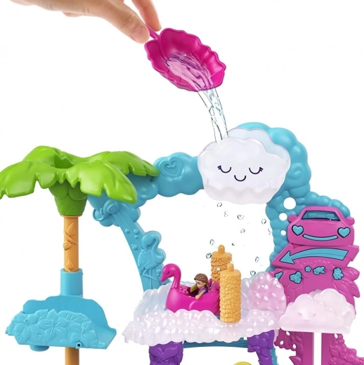 Na „spomaľovacom prahu“ sa odhalia prvky benzínovej stanice s hadicou v tvare plameniaka – pripraviť, natankovať a hurá späť do akcie! V aute sa odvezie bábika aj zvierací kamarát (tukan alebo lenochod). Set je kompatibilný s väčšinou vozidiel POLLY POCKET a ponúka hodiny fantazijnej hry s vodnými prvkami.