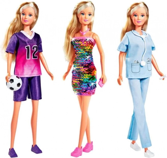 Bábika Steffi a 3 rôzne oblečky: flitrové šaty SWAP, lekársky oblečok a futbalový oblečok. Dodáva sa s doplnkami.