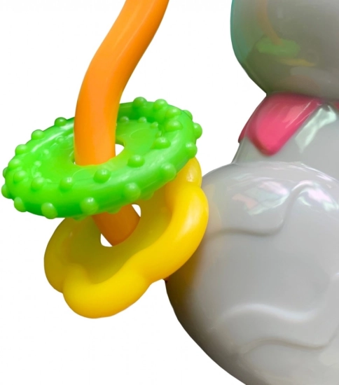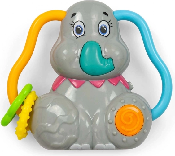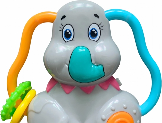 Interaktívny dizajn: Hrkálka v tvare slona je vybavená priestorovými uškami pre ľahký úchop a posúvanie farebných krúžkov. Stlačením chobota zaznie zvuk slona a medzi šiestimi melódiami možno prepínať pomocou oranžového kolieska.