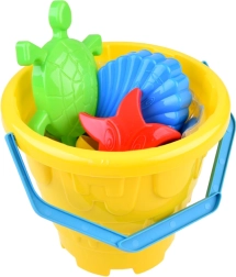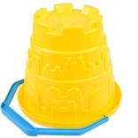 Plastový vedro s modrou rukoväťou a formičkami vo vnútri vám umožňuje ľahké prenášanie na pláž alebo do záhrady.