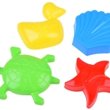 Štyri plastové formy v tvare kačice, mušle, korytnačky a hviezdy pre ľahké a zábavné tvarovanie dynamického piesku.
