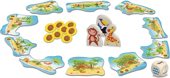 9 ostrovov, 1 pevnina, 8 kokosov, 3 drevené figúrky, 1 veľká drevená kocka, Príručka pre rodičov