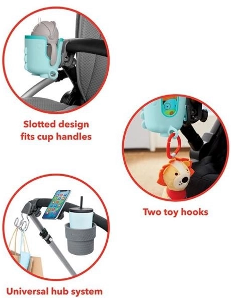 Majte kávu, fľašu so slamkou aj detský hrnček vždy poruke vďaka univerzálnemu držiaku na nápoje SKIP HOP. Jeho chytrý dizajn pasuje aj na hrnčeky s uškami, univerzálne uchytenie sa ľahko pripevní na väčšinu kočíkov, bicyklov či nákupných vozíkov a pružné vložky bezpečne podržia rôzne veľkosti nádob. Navyše ponúka dva háčiky na hračky pre zábavu na cestách.