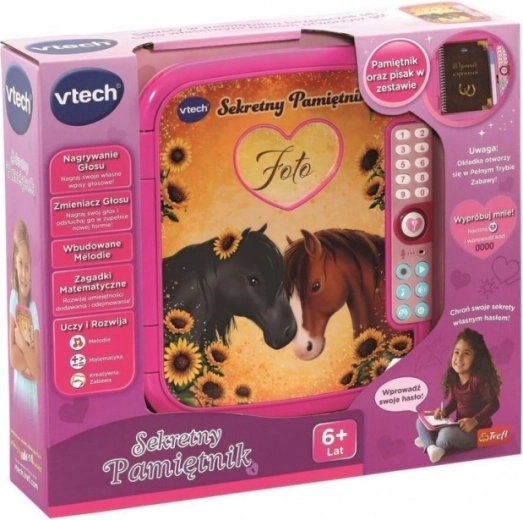 Uchovajte si všetky svoje tajomstvá v bezpečí s tajným denníkom VTech na číselný kód. Na obálku vložíte vlastnú fotografiu, vo vnútri nájdete priestor na zápisky, farebné pero a skrytú skrýšu pokladov. Denník vie nahrávať a prehrávať hlas a vďaka meniči hlasu pridáte zábavné efekty k svojim správam.