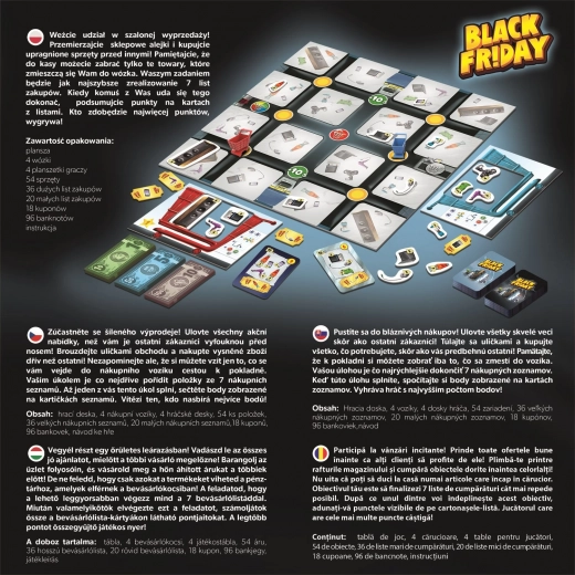 Spoločenská hra Black Friday vás zavedie do víru šialených výpredajov. Vašou úlohou je čo najrýchlejšie nakúpiť tovar zo 7 nákupných zoznamov. Kto z vás pozbiera najviac bodov, stane sa víťazom!