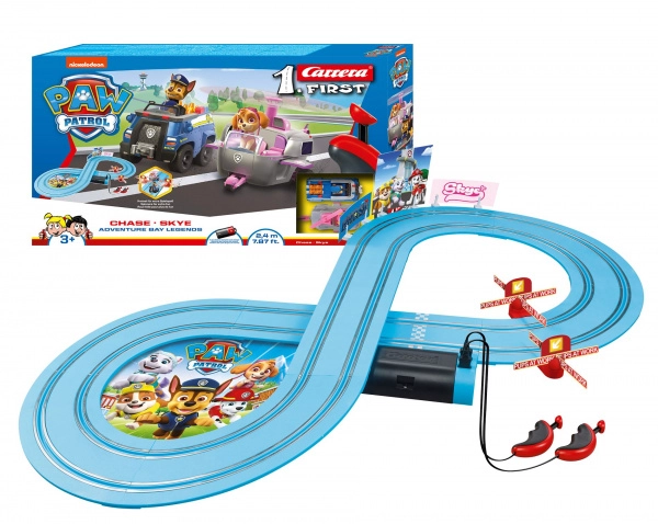 Objavte svet pretekania s autodráhou Carrera First Tlapková patrola. Vďaka prehľadnému ovládaniu a odolnému prevedeniu je táto autodráha perfektná pre malých pretekárov. Dve detailne spracované autíčka Chase a Skye sa vďaka magnetom a kontaktným kefkám skvele držia na trati, zatiaľ čo točiace sa vrtule dodajú jazde napätie a zábavu.