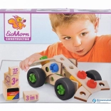 Drevené stavebnice Eichhorn Constructor rozvíjajú predstavivosť pri stavaní rôznych modelov. Sada Pretekár 3 v 1 prináša trojitú zábavu a umožňuje zostaviť 3 modely: auto Formuly 1 a 2 rôzne pretekárske autá. Vďaka priloženému návodu môžete vybrané modely ľahko zostaviť. Sada obsahuje 35 dielov, ako sú bloky, výlisky, kolesá, skrutky a matice. Kvalita Vyrobené v Nemecku Vďaka zaobleným rohom a hranám, materiálom bez škodlivých látok a zmäkčovadiel a kontrole kvality zaručujeme hračky najvyššej kvality. 100 Certifikované drevo FSC Pri výrobe modelov Constructor sa používa iba certifikované bukové drevo. Licenčné číslo: FSC-C005308. Prostredníctvom hry sa deti učia priestorovému mysleniu a precvičujú si motorické zručnosti už od útleho veku. Stavebná hračka je vhodná pre deti od 3 rokov.