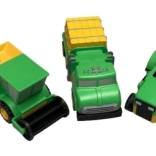Súčasťou sú modely traktora, kombajnu a nákladného vozidla s odnímateľnými časťami. Robustný plast odolá každodennému hraniu, zatiaľ čo realistické detaily a nápisy typu „Popular Farms“ podporujú tematické príbehy z farmy.