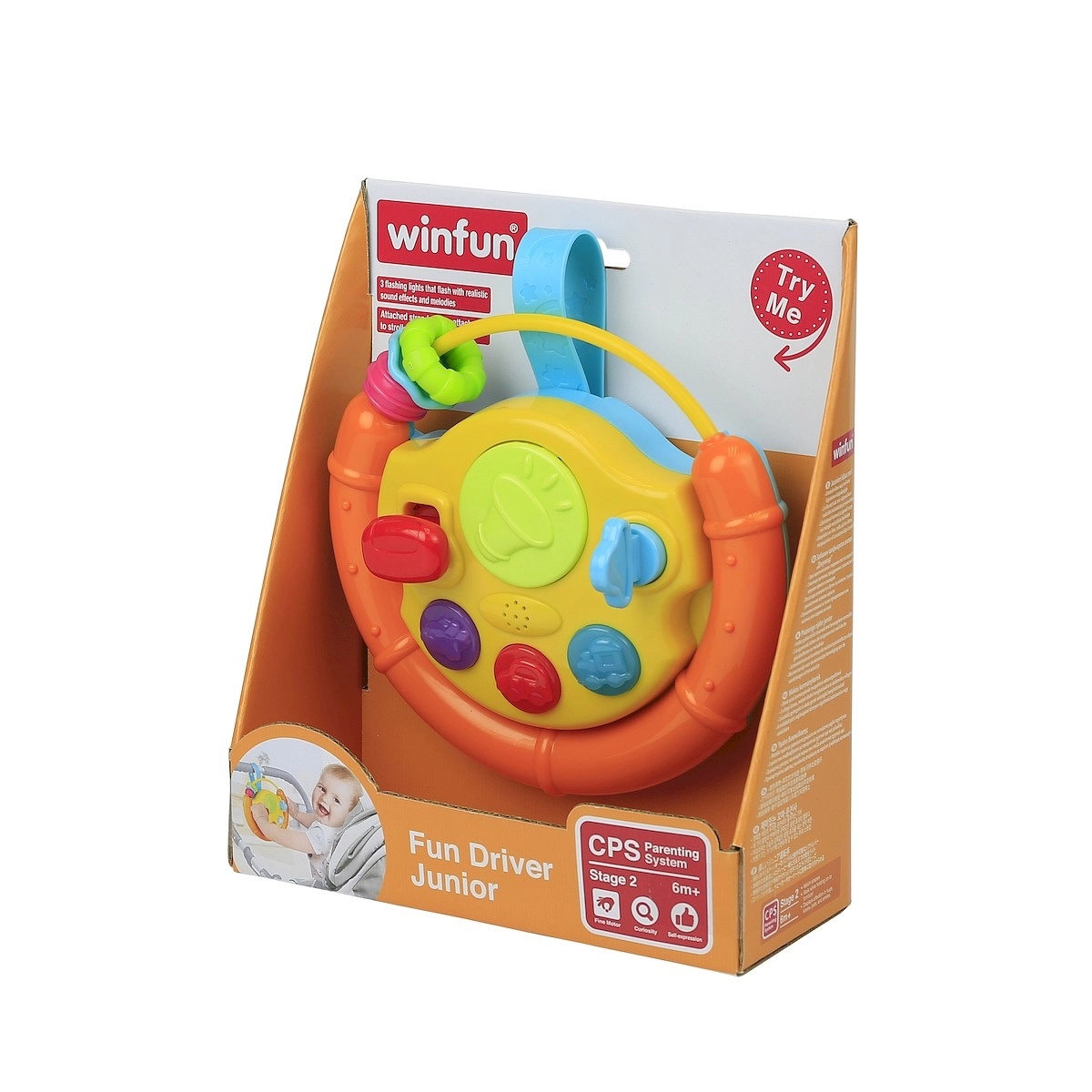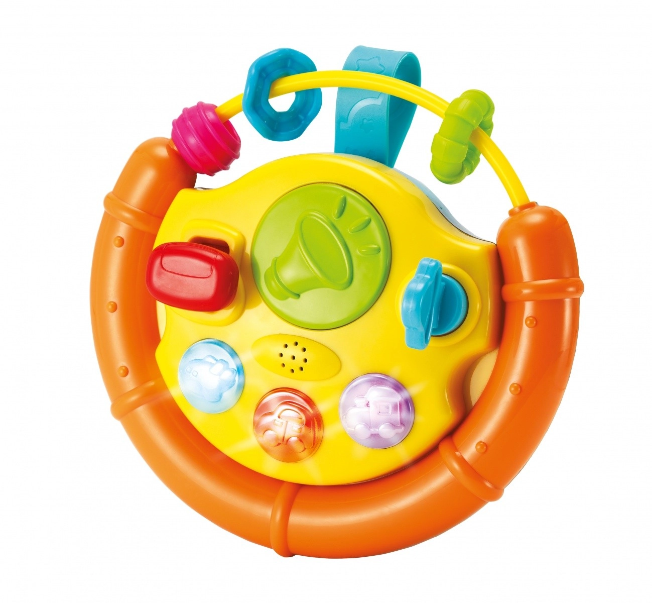 Tento farebný volant je ideálna aktivizačná hračka pre najmenších. Deti zaujmú blikajúce svetielka, veselé melódie a rôzne hmatové podnety. Pohyblivé súčasti ako gulička, autíčko či rybka lákajú k skúmaniu a precvičujú úchop aj koordináciu oko–ruka.