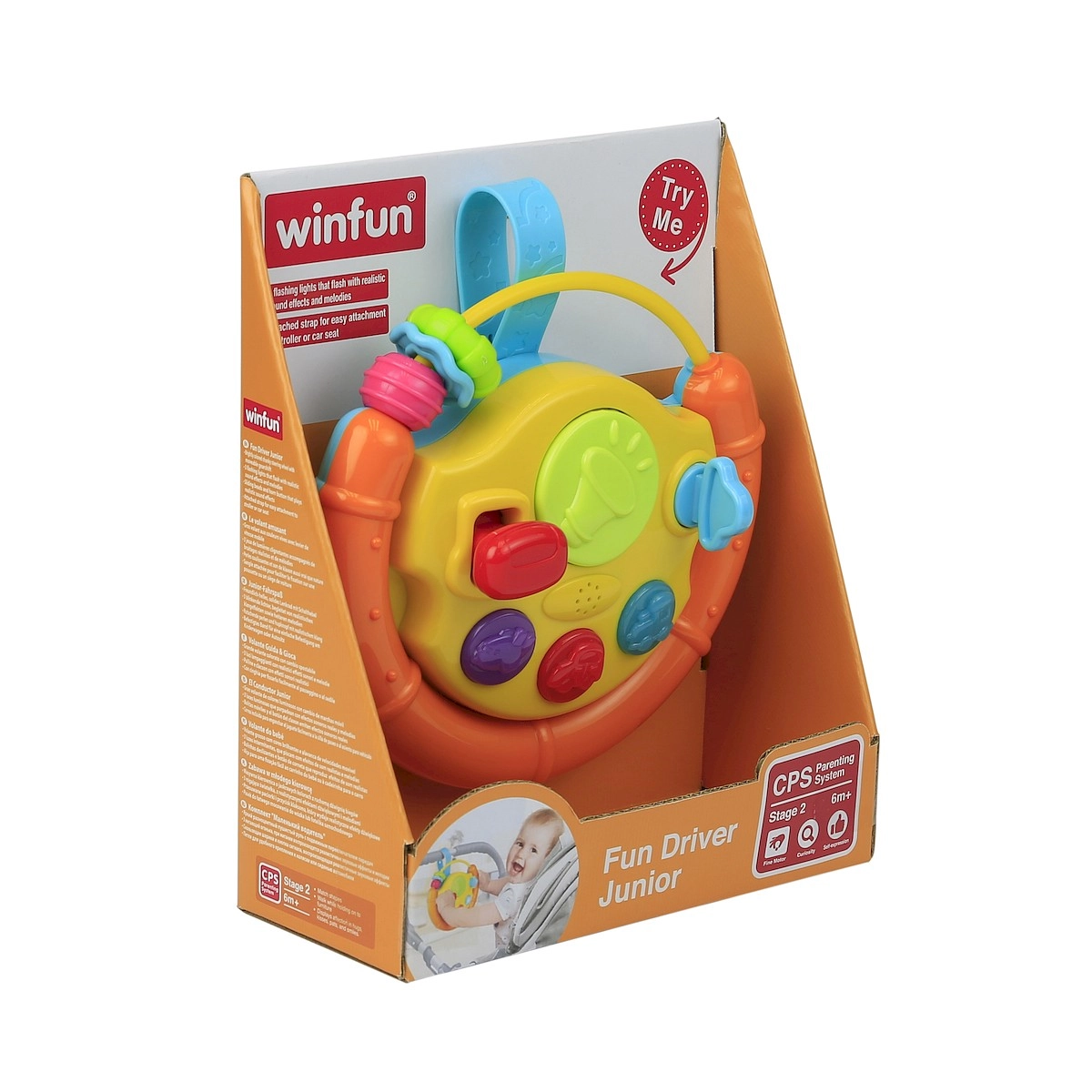 Vďaka praktickému popruhu hračku ľahko pripevníte na postieľku, autosedačku alebo kočík. Otočná spínacia skrinka s kľúčikom, funkčné tlačidlá a točiace sa prvky predlžujú čas hrania a pomáhajú rozvíjať sluch, zrak i motorické zručnosti.