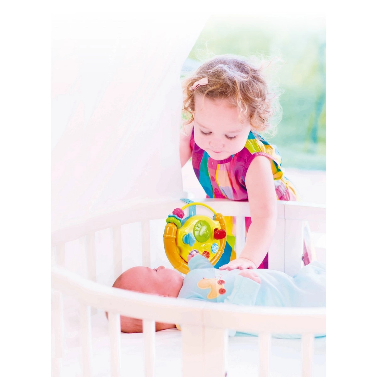 Vďaka integrovanému popruhu volant jednoducho pripevníte k postieľke, autosedačke alebo kočíku pre zábavu na cestách.