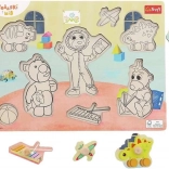 Drevená skladačka s motívom BOBASKI I MIŚ je navrhnutá pre najmenšie deti. Pevné dieliky s veľkými drevenými gombíkmi sa ľahko držia aj drobným rúčkam. Podložka s vyfrézovanými tvarmi a zhodnou čiernobielou grafikou pod dielikmi dieťaťu uľahčí správne priradenie tvarov a podporí jeho samostatnosť pri hre.
