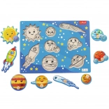 Drevená vkladačka s vesmírnymi motívmi je skvelou voľbou pre prvé logické hry. Vďaka dreveným knobom sa diely ľahko držia aj malými rúčkami a deti si pri hre trénujú presnosť a trpezlivosť. Čiernobiela grafika v prehĺbeninách kopíruje obrázok na dielikoch a uľahčuje správne umiestnenie.