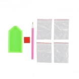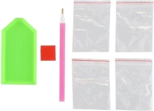 Sada obsahuje všetky potrebné veci na diamantovú maľbu: plátno, aplikačné pero, misku, vosk a farebné kamienky.