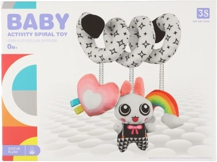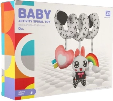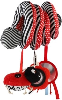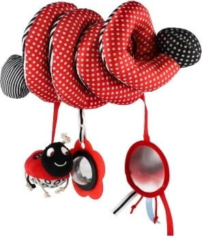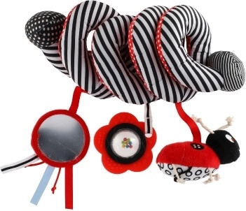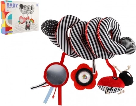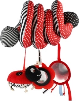Krásna plyšová hračka do postieľky v kontrastných farbách pre vaše bábätko. Hračka s hrkálkami a zrkadielkom pomáha pri rozvoji zmyslového vnímania bábätka a stimuluje jeho predstavivosť. Vďaka špirálovitému tvaru ju možno pripevniť na postieľku, autosedačku alebo kočík.