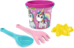 Kompletný set: vedierko, lopatka, hrabličky a formička na tvorbu báboviek a hradov z piesku.