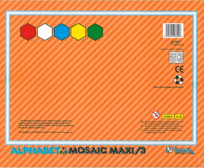 Objavte svet písmen s farebnou stavebnicou Alphabet Mosaic Maxi. Vďaka veľkým dielikom v žltej, červenej, zelenej, modrej a bielej farbe sa deti hravou formou zoznamujú s anglickou abecedou, učia sa skladať jednoduché slová a rozvíjajú svoju predstavivosť aj trpezlivosť.