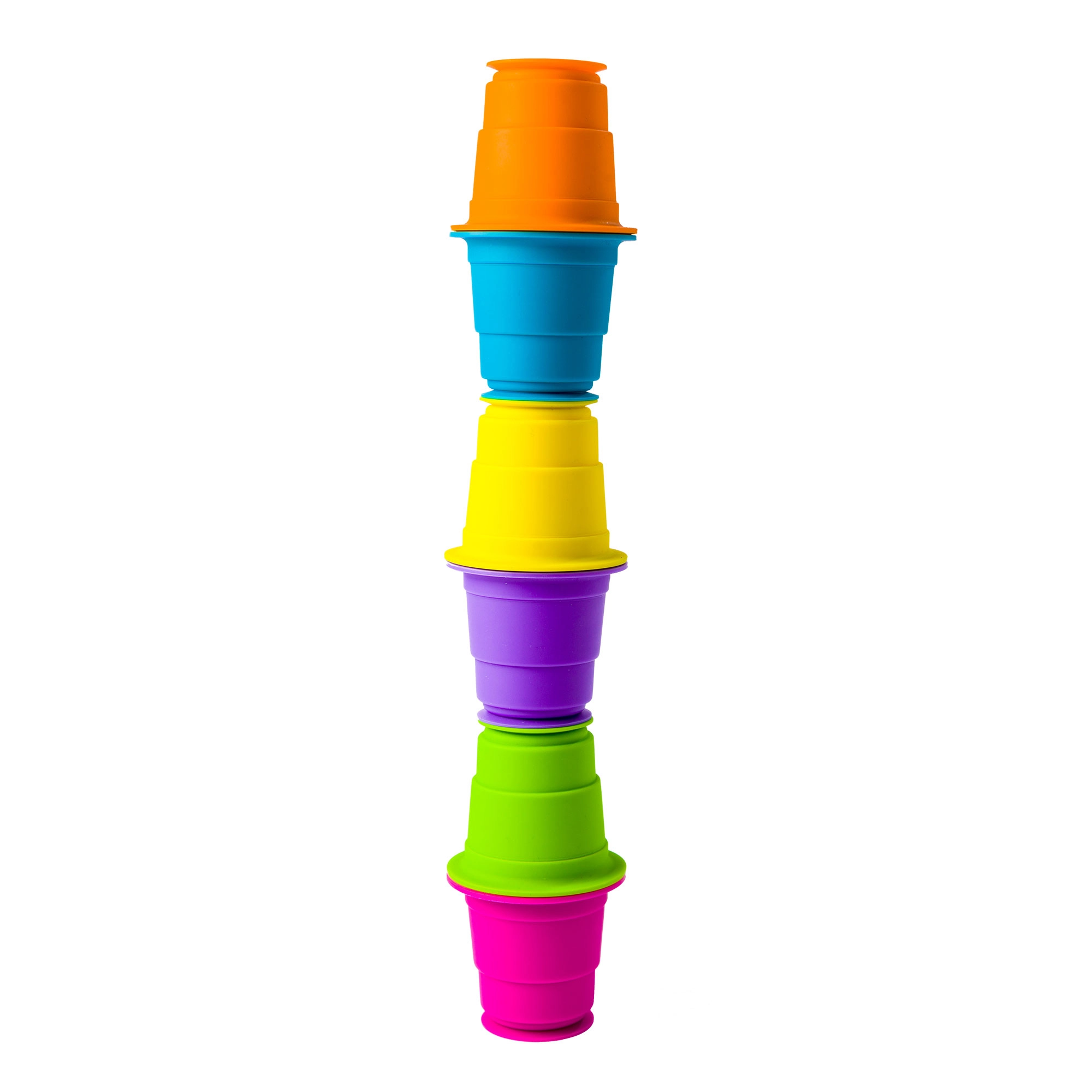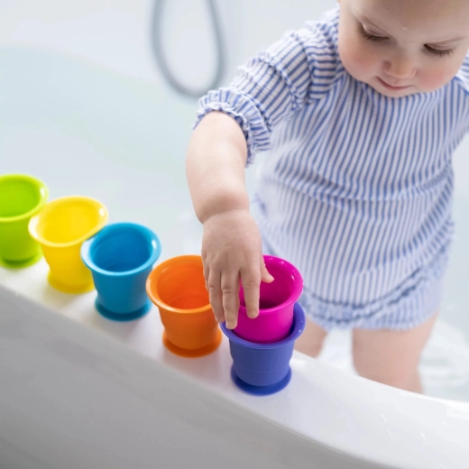 Vďaka integrovaným prísavkám poháriky ľahko priľnú k hladkým povrchom – na stole, vo vani aj na chladničke. Ideálne na kreatívne stavanie a vodné hry.