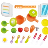 Súčasťou je bohaté príslušenstvo, ktoré napodobňuje skutočné kuchynské náradie. Deti môžu „variť“, servírovať a upratovať, čo podporuje samostatnosť a kreatívne myslenie.