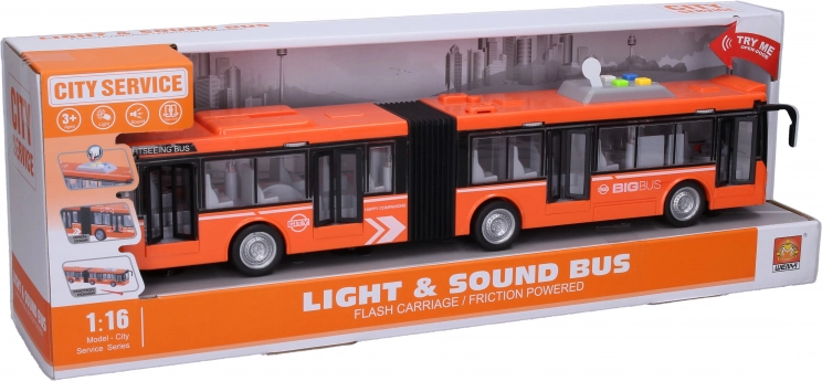 Veľký autobus poteší realistickými detailmi a jednoduchým ovládaním. Zotrvačník zabezpečuje plynulú jazdu bez potreby batérií na pohon, zatiaľ čo svetelné a zvukové efekty aktivujete štyrmi tlačidlami na streche. Deti si užijú množstvo zábavy pri hre na vodiča a cestujúcich.