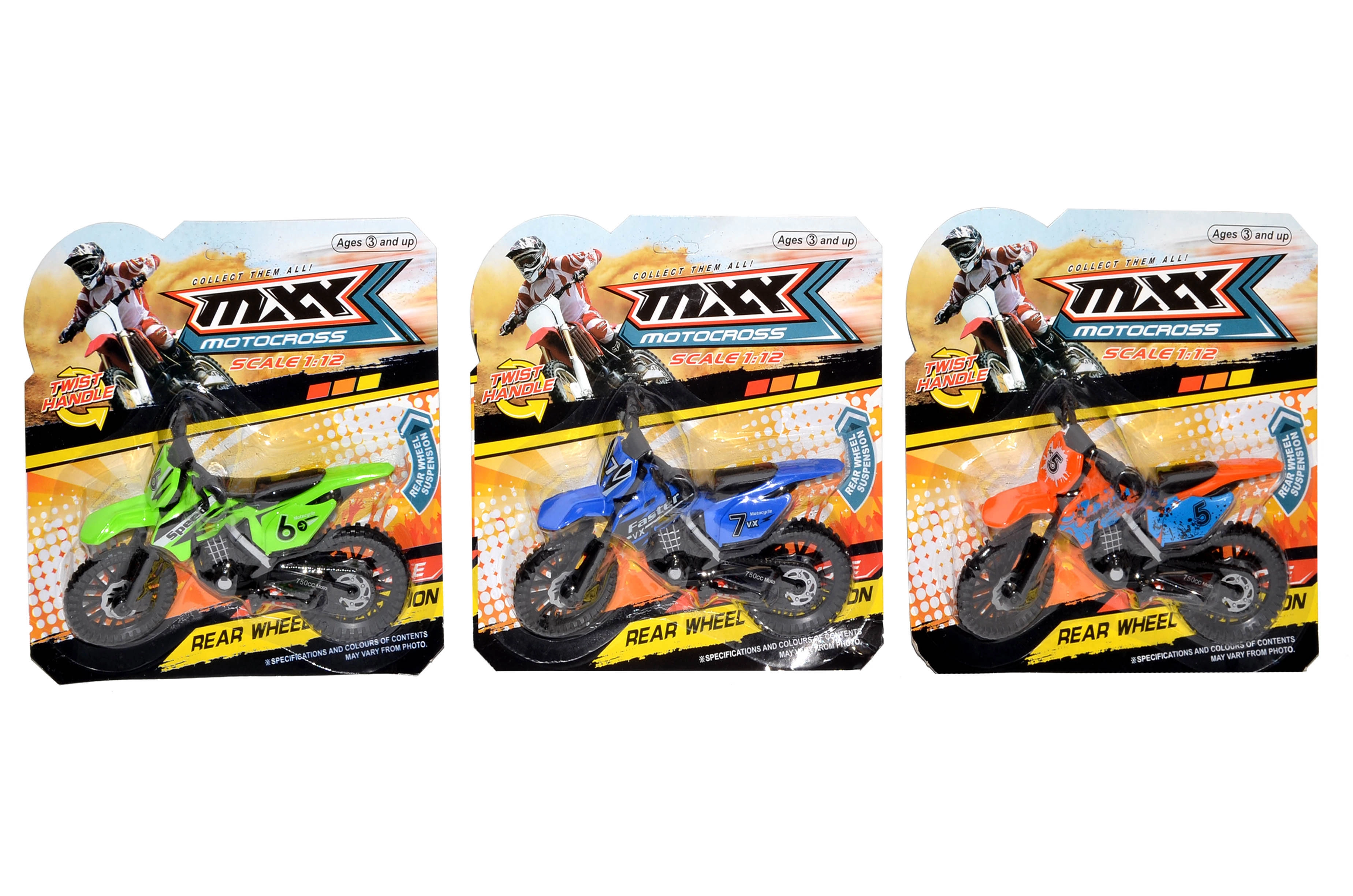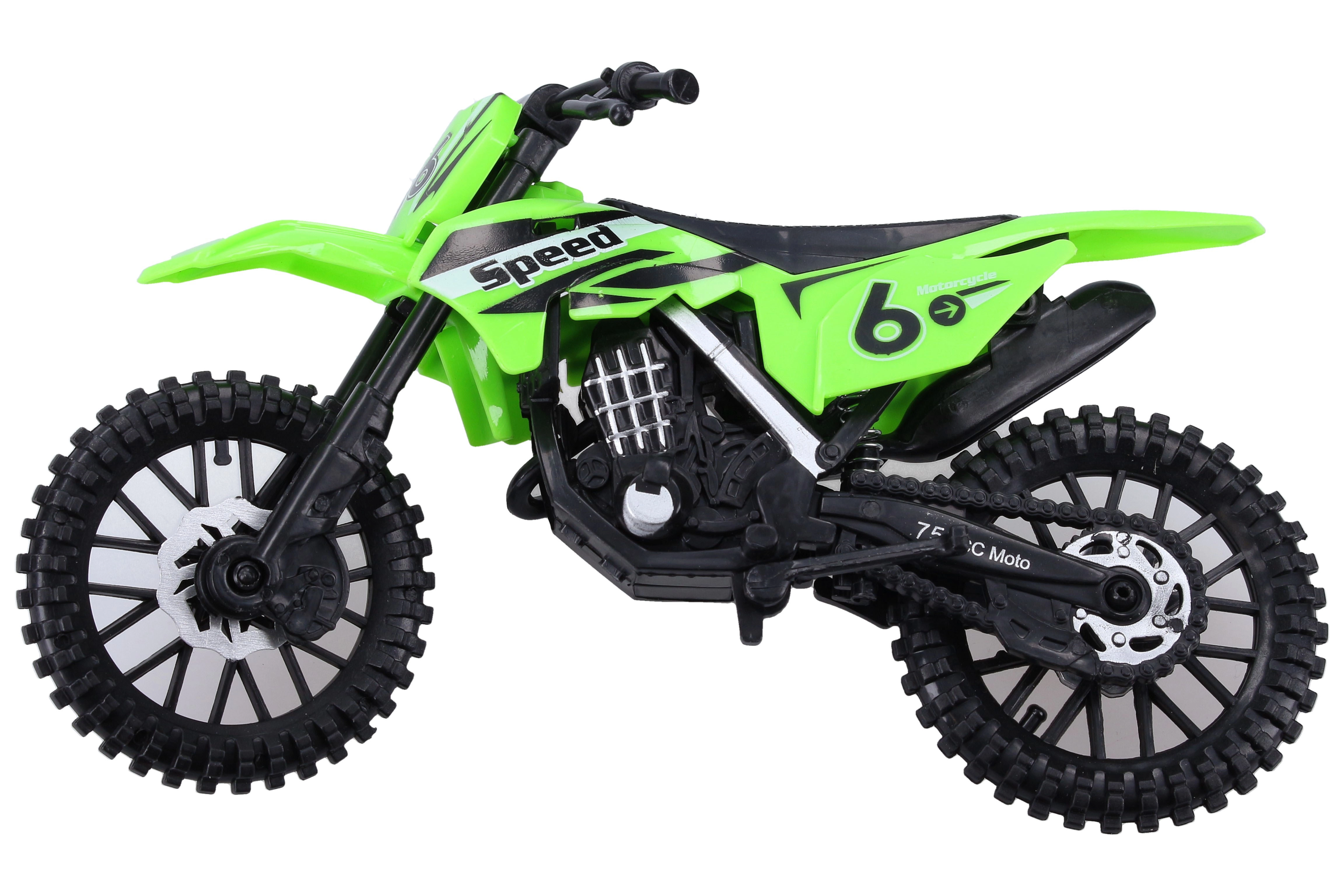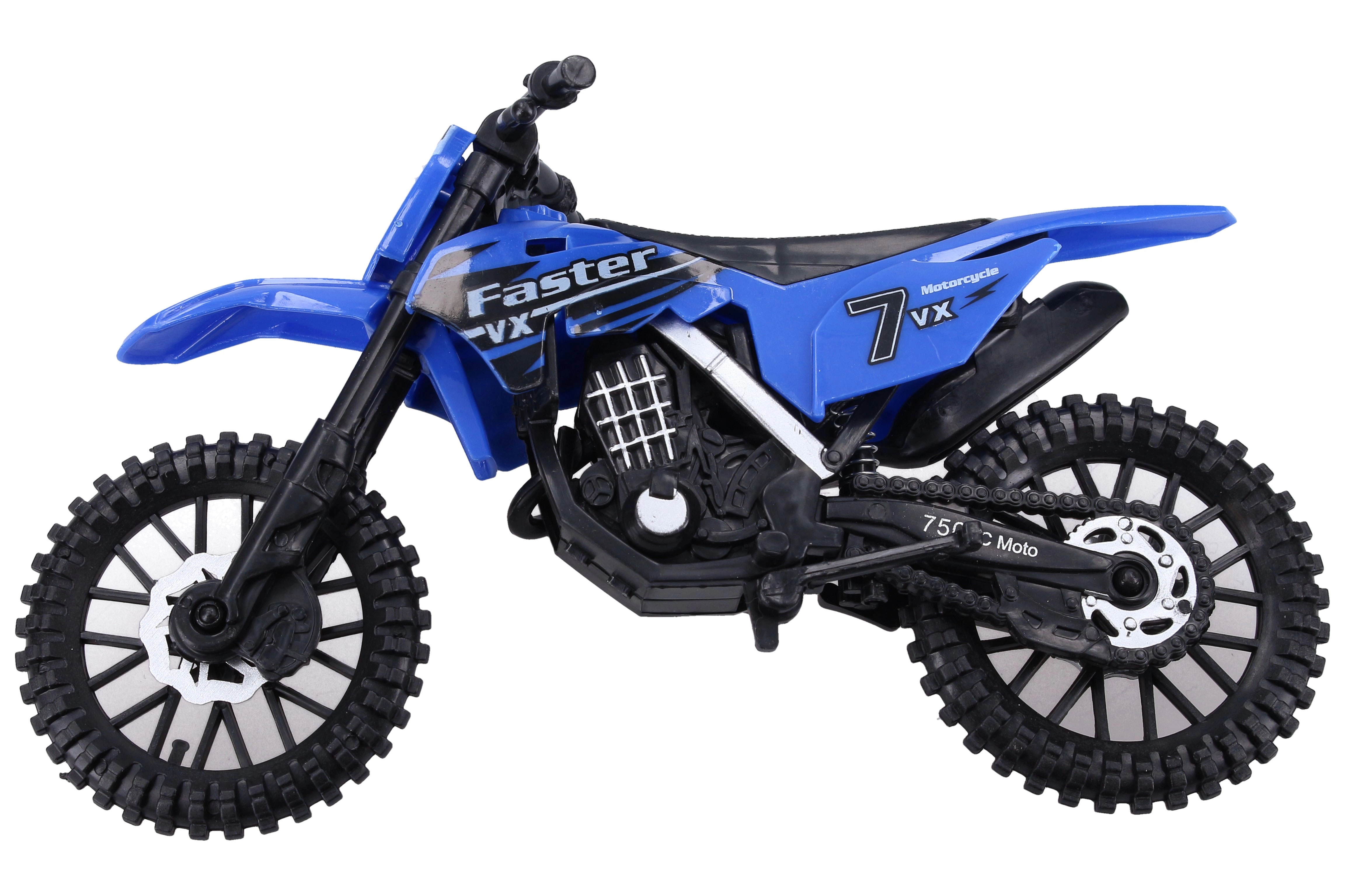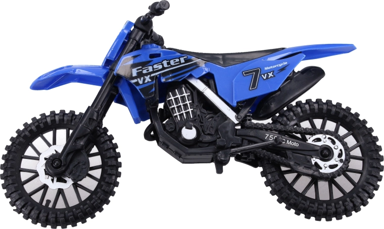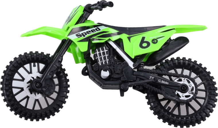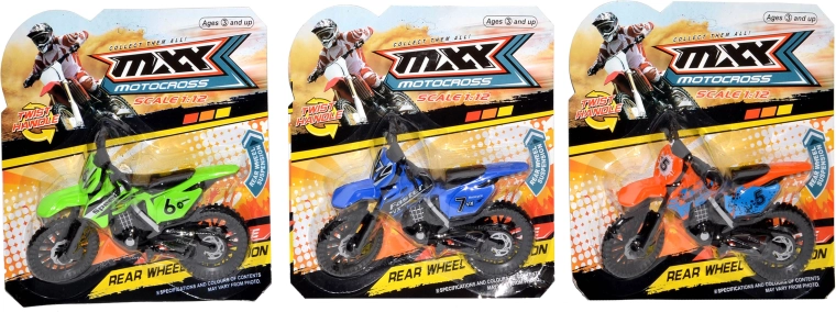 Motorka je k dispozícii v 3 farebných variantoch s pretekárskymi potlačami (čísla, nápisy) a pôsobivým off-road štýlom. Kompaktná veľkosť 19 cm skvele padne do detskej ruky aj do batôžka na cesty.