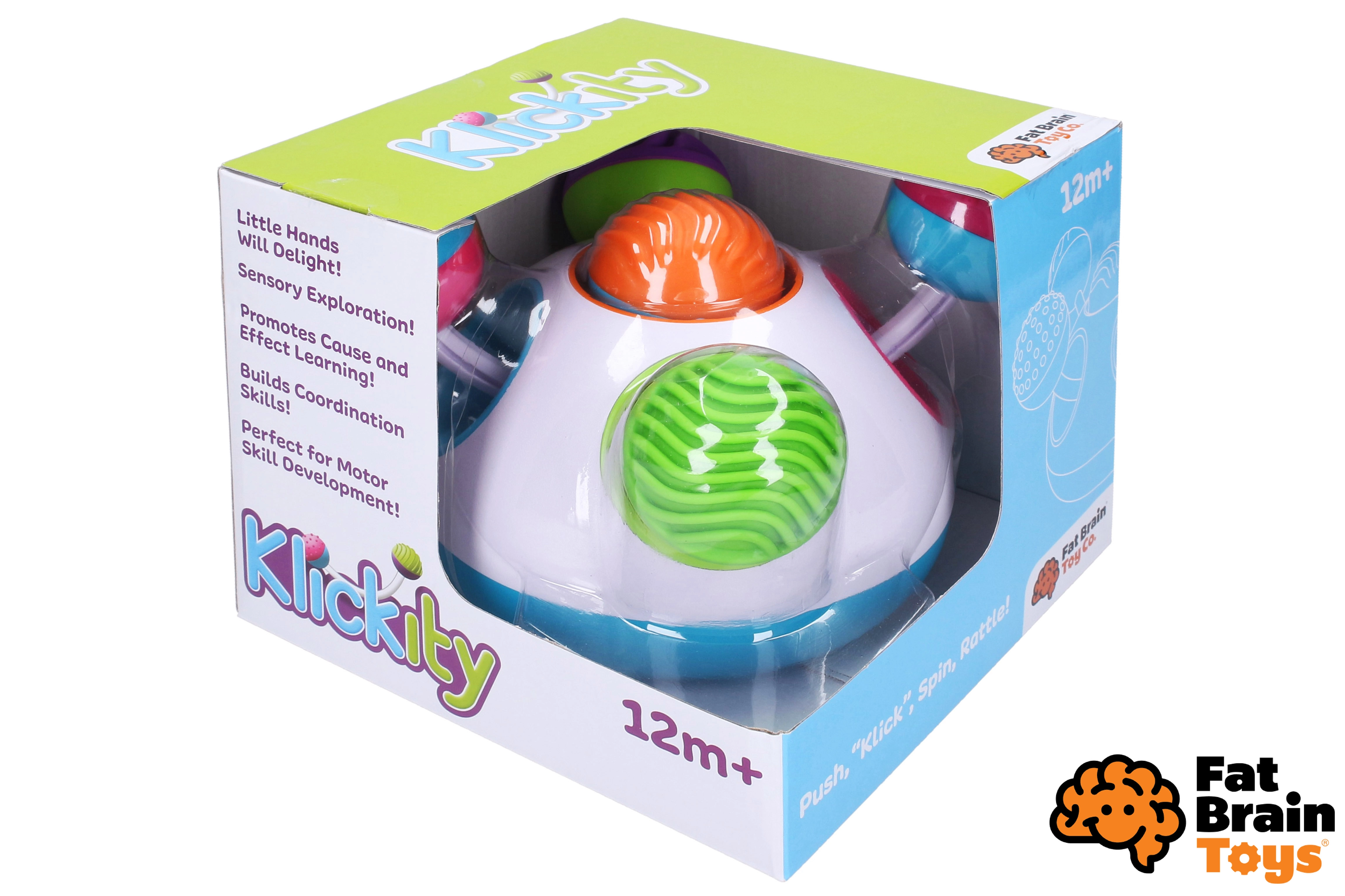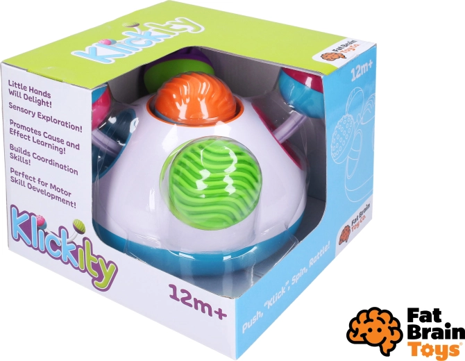Fat Brain Klickity je šikovná motorická hračka, ktorá podnecuje prirodzenú detskú zvedavosť. Kombinácia kontrastných farieb, príjemných textúr a jednoduchých mechanických funkcií (stláčanie, vytláčanie, otáčanie) prináša dlhé minúty sústredenej hry a rozvoja zručností.