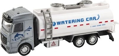 Model polievacieho vozidla so sivou kabínou a bielou nádržou, ktorý ponúka možnosť tematickej hry s vodnými prvkami.