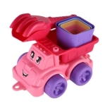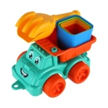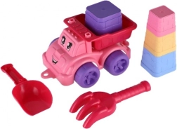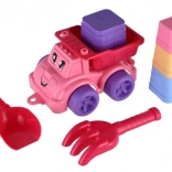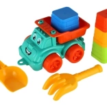 Farebné plastové autíčko s veselým výrazom je perfektné pre prepravu piesku a rozvoj detskej fantázie.