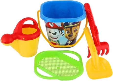 Súpravu na piesok s motívom Tlapkovej patroly si zamilujete! Hračky na piesok využijete na dovolenke pri mori, na detskom ihrisku alebo na záhrade celá rodina. Súprava obsahuje vedierko, formičku, hrabličky s lopatkou, kanvičku a sitko.