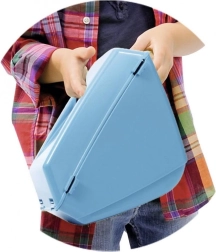 Modrý kôš možno ľahko vybrať a zavesiť na madlo. Deti môžu „zbierať trávu“ a zlepšovať svoje motorické zručnosti.