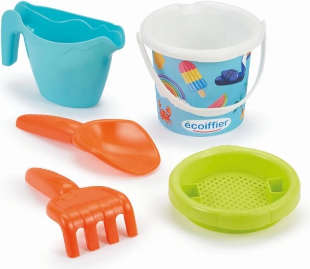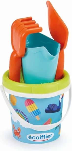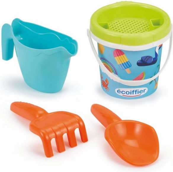 Detské vedierko s letným motívom a praktickými doplnkami na piesok: kanvička, sito, hrabličky a lopatka.