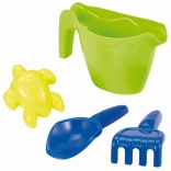 Nákladné auto s dĺžkou 33 cm obsahuje kanvičku, hrabličky, lopatku a formičku na piesok, ideálne pre detské hry vonku.