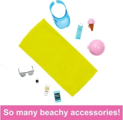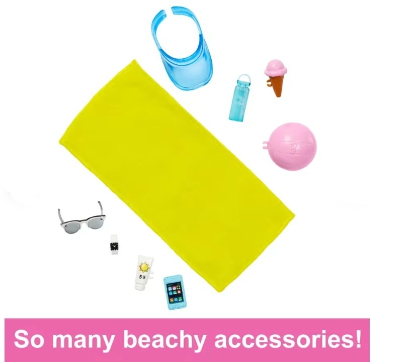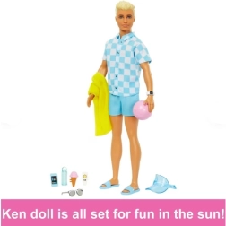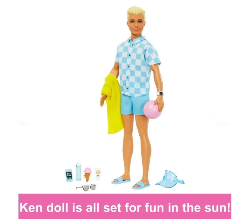 - Bábika Ken, košeľa, plavky, šľapky, šilt, slnečné okuliare, hodinky, uterák, fľaša na vodu, opaľovací krém, smartfón, plážová lopta, zmrzlinový kornút
