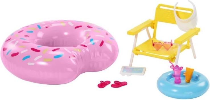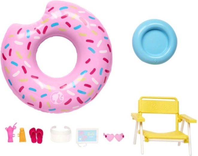 Ružové nafukovacie koleso v tvare donutu, žlté lehátko a plážové drobnosti (okuliare, žabky) pre príbehy na pláži či pri bazéne.